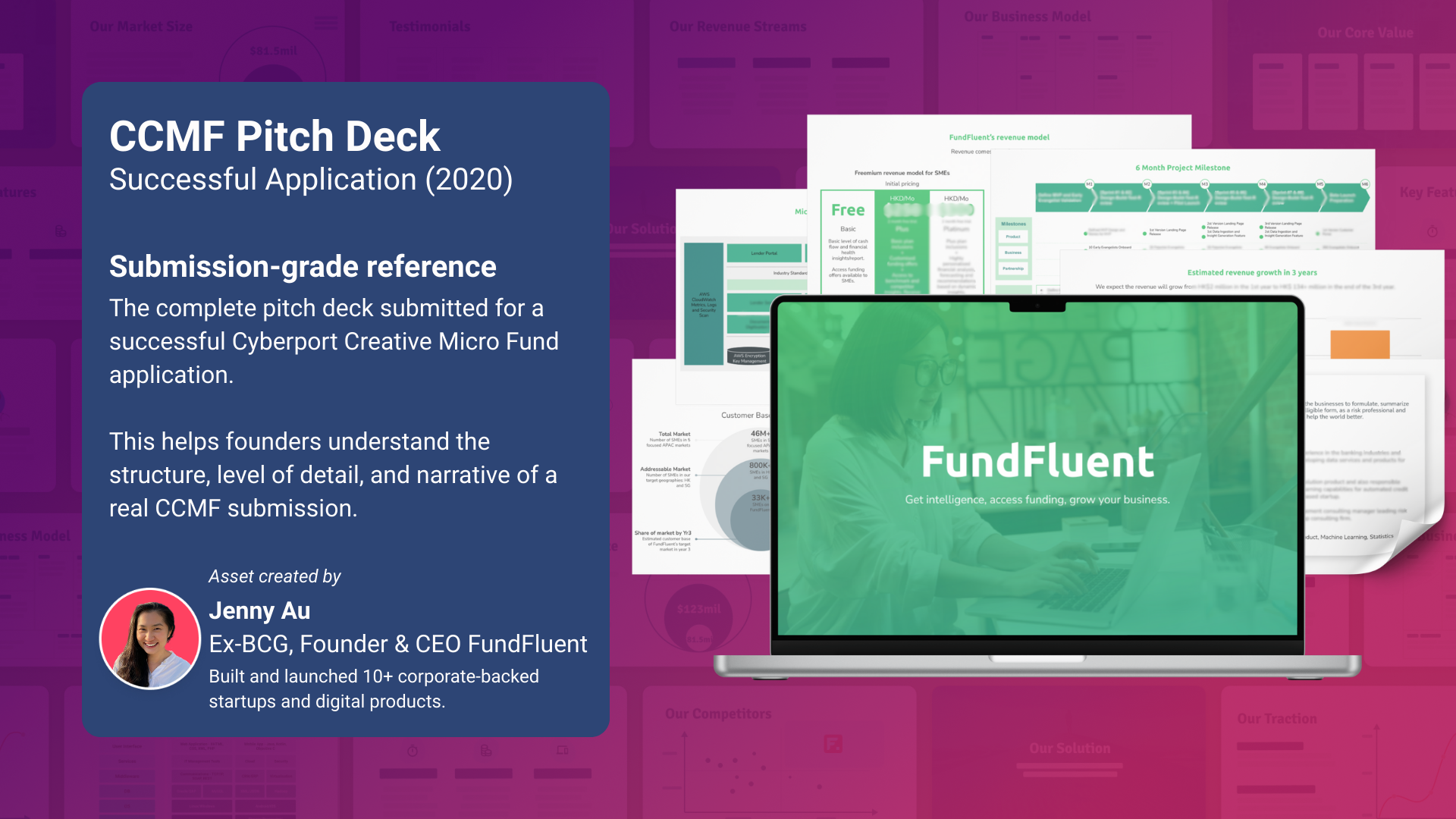 FundFluent’s pitch deck submitted as part of the Cyberport Creative Micro Fund (CCMF) application in 2020. Shared as a reference artefact to help founders understand the structure, level of detail, and narrative of a real CCMF submission.